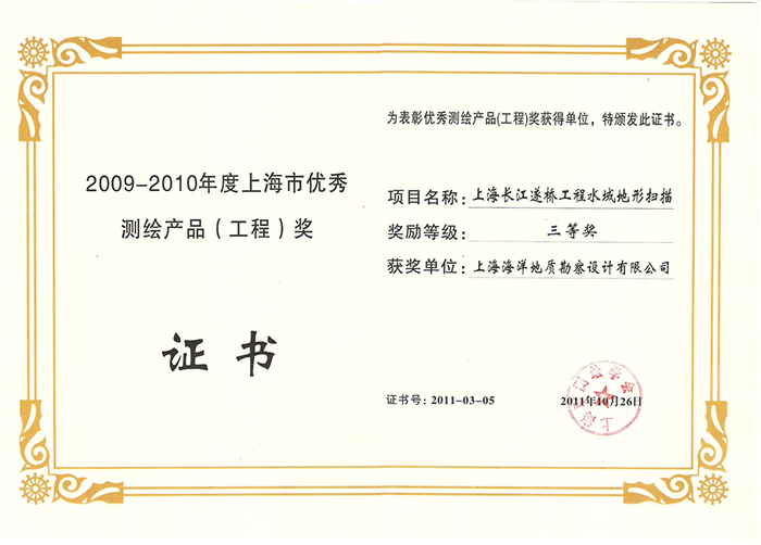 《上海長江隧橋工程水域地形掃描》榮獲2009-2010年度上市優(yōu)秀測繪產(chǎn)品(工程)三等獎(jiǎng)